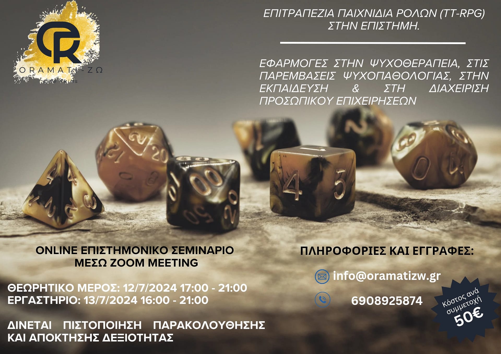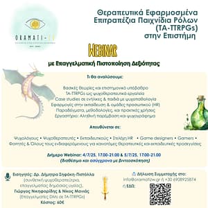 Για άλλη μια φορά, η επιστημονική ομάδα του Oramati-Zω προσφέρει το webinar απόκτησης δεξιοτήτων για τα Θεραπευτικά Εφαρμοσμένα Επιτραπέζια Παιχνίδια Ρόλων στην Επιστήμη σε προνομιακή τιμή (60€). Δήλωσε συμμετοχή εδώ